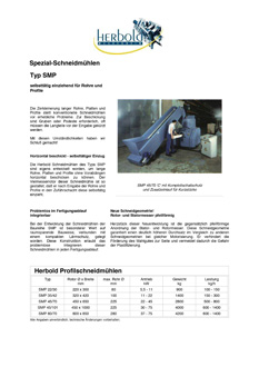 Eine Herbold-Schneidmühle der Baureihe SMP eignet sich für die Verarbeitung von Profilen und Rohren. Es handelt sich hierbei um selbsteinziehende Maschinen mit horizontalem Beschicktrichter für Langstäbe von sechs und mehr Metern Länge. Ein Zusatzeinlauf für Kurzstücke und Gehrungsabschnitte ist lieferbar.